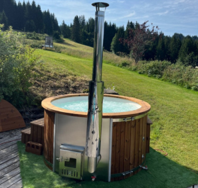 Bain nordique 6-8 places de forme ronde en fibre de verre et habillage en bois Thermotraité (THT) avec Poële à bois déporté.